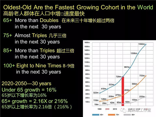未來30年,從2020年到2050年,65歲的老人數(shù)量要翻2倍,75-85歲翻3倍,100歲翻8-9倍,與之相比,65歲以下的人口增長率僅為16%左右,可以想象這種高增長率會給養(yǎng)老帶來很大的問題。