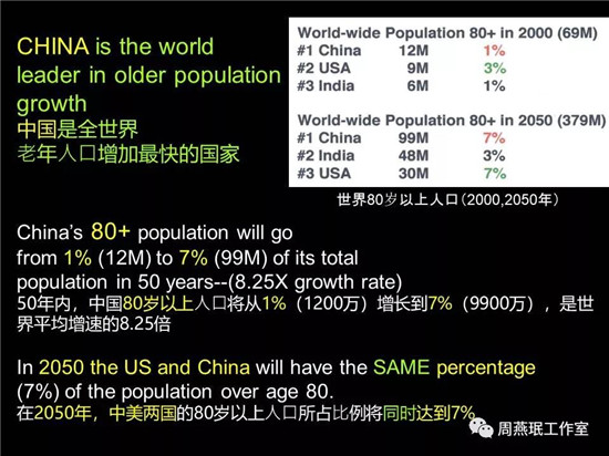 中國80歲以上的老人會從目前的1200萬增加到9900萬,到2050,中國老年人口占全國人口的比例跟美國是一樣的。但是中國的絕對人口數(shù)量是要比美國多幾倍的,美國人認(rèn)為這是非常大的問題,對中國來說,這個(gè)挑戰(zhàn)尤為巨大。