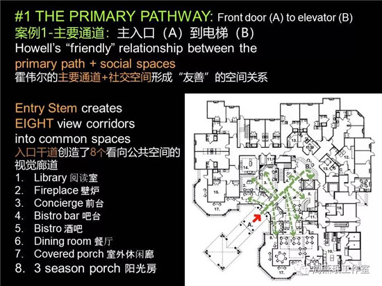 在過去的30年中,美國、歐洲的養(yǎng)老設(shè)施建筑的研究慢慢發(fā)現(xiàn),主要通道(從入口到主電梯的這一段)的空間設(shè)計(jì)十分重要,如果能夠做得比較友善,會利于人們對建筑形成友善的印象。