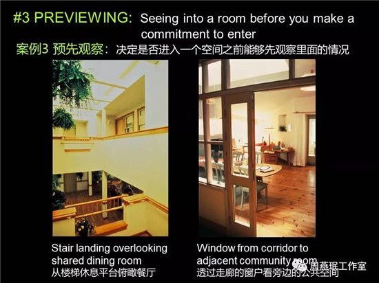 考慮到人們對社會關(guān)系的本能認(rèn)知,進(jìn)入房間之前,如果能夠看到里面的情況,對于人的心理感受會有很好的提升。這兩個(gè)案例都是通過窗戶或者是降低扶手的高度的方式,起到在相互交往或者決定交往之前能夠提前預(yù)判的作用。