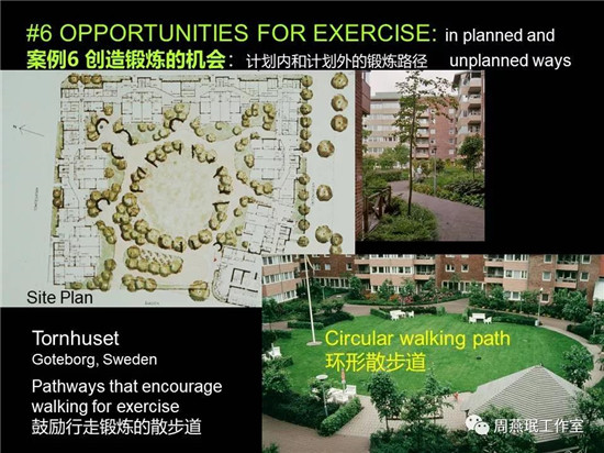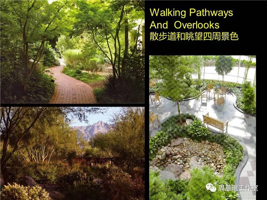 以上內(nèi)容都是體現(xiàn)如何讓景觀對老人起到作用的。景觀對于骨密度、日常拉伸、老人認(rèn)知都有很好的作用。遠(yuǎn)景、近景相結(jié)合、水元素的運(yùn)用,不同的石子都可提供給老人鍛煉健身的機(jī)會。在設(shè)計(jì)中可根據(jù)實(shí)際情況加以考慮。