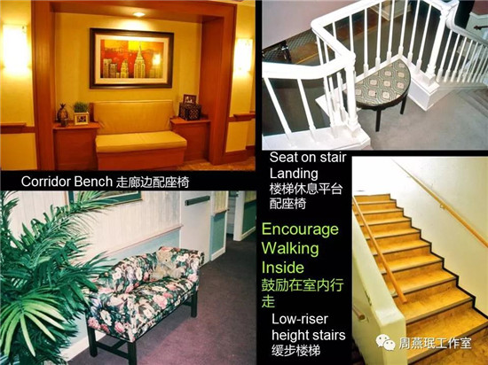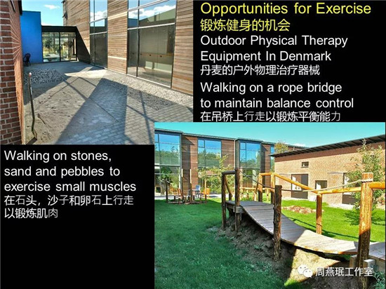 鍛煉不光在室外,在室內(nèi)一定要繼續(xù),走廊、樓梯都存在老人鍛煉的機(jī)會。除了座椅是必須設(shè)置的,臺階的高度也一定要控制好,另外踏步之間布置休息平臺也十分必要�?傊�鍛煉的理念要從室內(nèi)到室外,貫始至終。