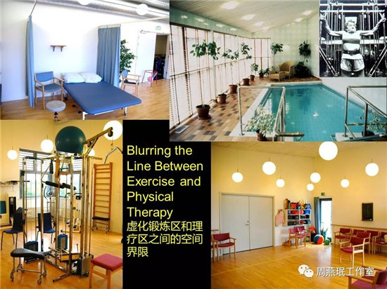 鍛煉對于每個(gè)人來說都得做,護(hù)理、理療或者是康復(fù)訓(xùn)練是一部分老人需要做。與其將他們分開,不如讓他們結(jié)合到一起。圖中是歐洲一個(gè)建筑中所有有關(guān)理療和鍛煉的空間,可以看出,通過合理的手段將這兩者有機(jī)的結(jié)合在一起相當(dāng)重要。