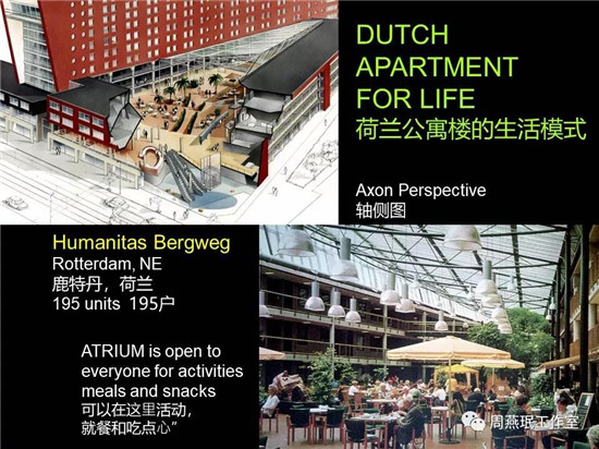 這個(gè)項(xiàng)目就是引出我今天要講的一個(gè)重要方面——生活模式,荷蘭公寓樓的生活模式。這個(gè)模式強(qiáng)調(diào)的就是,其實(shí)很多老人不需要入住護(hù)理院的,絕大多數(shù)通過這樣的專門設(shè)施,實(shí)現(xiàn)就地養(yǎng)老是最理想的。這個(gè)項(xiàng)目時(shí)間很久了,是90年代在荷蘭鹿特丹的項(xiàng)目,項(xiàng)目本身就是采用這樣一個(gè)概念,老人可以就地老化,不要再搬出去了。這個(gè)項(xiàng)目居室情況是很有特點(diǎn)的,首先是為終身生活而設(shè)計(jì),面積非常大,可以個(gè)性化的進(jìn)行裝飾,很多老人在里面裝了非常多的書、收藏品等等。另外還有小的房間是給訪客居住使用的。