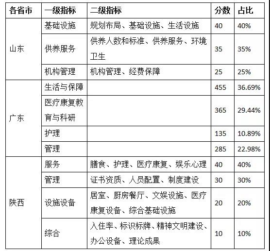 由上表可見,評分型評定標(biāo)準(zhǔn)對養(yǎng)老機構(gòu)的養(yǎng)老服務(wù)比較重視,總體看可以達到40%左右。
