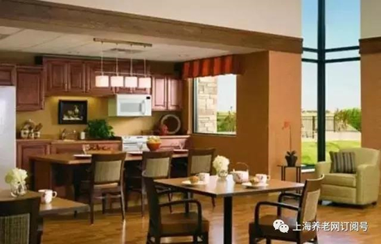 在餐廚房設(shè)計中,可以設(shè)置一個集中式廚房和餐廳,可以鼓勵認知癥老人通過感官刺激找尋食物。多個團組合的機構(gòu)中,食物可以在中央食堂供應(yīng),在每個團內(nèi)均設(shè)置餐廳,這樣員工更容易照顧那些選擇用餐時間和根據(jù)自己吃飯節(jié)奏選擇的老人;