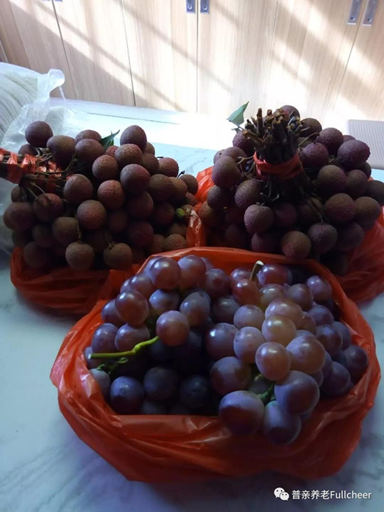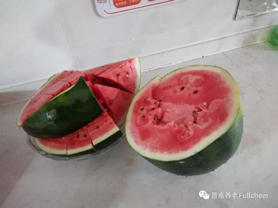 ▲不少家屬和志愿者來到機構(gòu)都會帶些水果給老人,大家一起分享吃得更開心。為了讓爺爺奶奶們方便食用,機構(gòu)的工作人員都會把西瓜都切成小塊或小片。還有這盆李子看起來酸酸甜甜的,多看兩眼,口水都要流出來了。