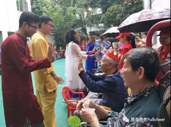 ▲普親養(yǎng)老院會(huì)定期為過(guò)生日的老人準(zhǔn)備生日會(huì),這一次正好是張爺爺?shù)纳�,�?guó)際友人的到來(lái)為張爺爺帶來(lái)了異域風(fēng)情的歌舞表演,戴上生日帽的張爺爺顯得精神十足。