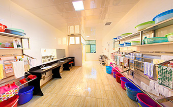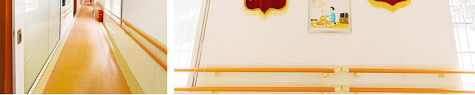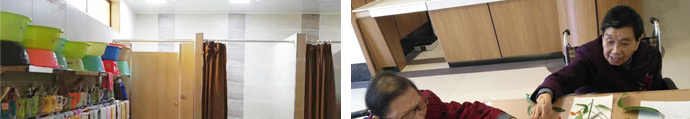 院內(nèi)裝修布局按照失能、失智老人不同標(biāo)準(zhǔn)合理安排,考慮護(hù)理操作的方便性和低風(fēng)險(xiǎn)性,同時(shí)兼顧隱私和互不干擾的原則,一樓設(shè)為失能老人生活區(qū),內(nèi)設(shè)康復(fù)室、護(hù)士站、臨終關(guān)懷室及老人用餐區(qū)。二樓設(shè)為失智老人生活區(qū),內(nèi)設(shè)護(hù)士站、用餐室。院區(qū)內(nèi)還設(shè)有公共洗衣房、廚房、倉庫以及后勤行政辦公室。