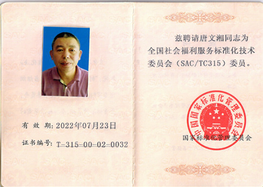 湖南普親老齡產(chǎn)業(yè)發(fā)展有限公司董事長唐文湘先生,被聘請為全國社會福利服務標準化技術委員會委員。