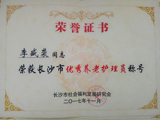 長沙普親老年養(yǎng)護院護理組長李盛襲女士,榮獲長沙市優(yōu)秀養(yǎng)老護理員稱號。
