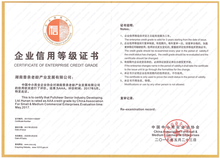 近日,湖南普親老齡產(chǎn)業(yè)發(fā)展有限公司榮獲“企業(yè)信用評(píng)價(jià)AAA級(jí)信用企業(yè)”,商業(yè)信譽(yù)和優(yōu)質(zhì)的服務(wù)水準(zhǔn)獲得了第三方權(quán)威機(jī)構(gòu)的認(rèn)可。