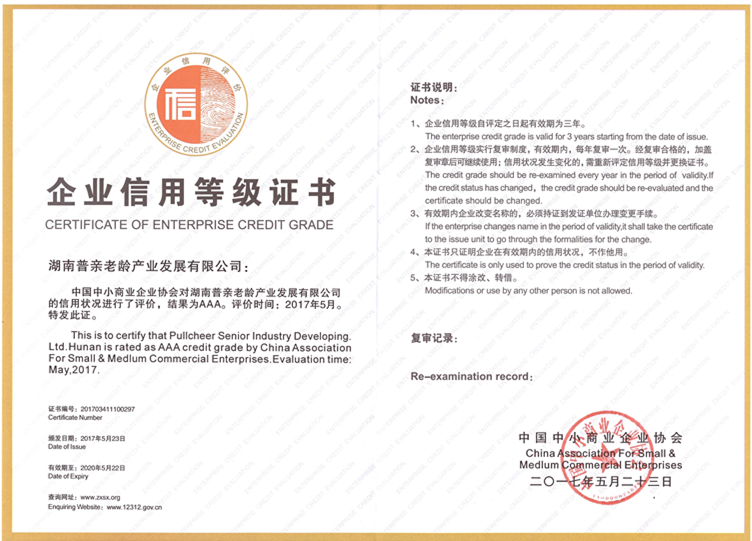 中國中小商業(yè)企業(yè)協(xié)會(huì)對湖南普親老齡產(chǎn)業(yè)發(fā)展有限公司的信用狀況進(jìn)行了評價(jià),結(jié)果為AAA。