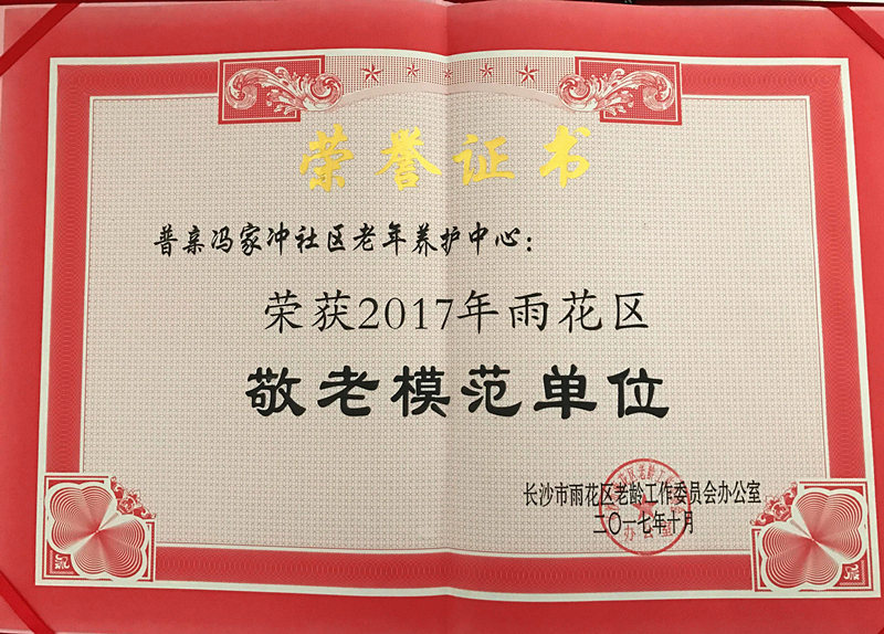 長沙普親馮家沖社區(qū)老年養(yǎng)護中心:榮獲2017年雨花區(qū)“敬老模范單位”