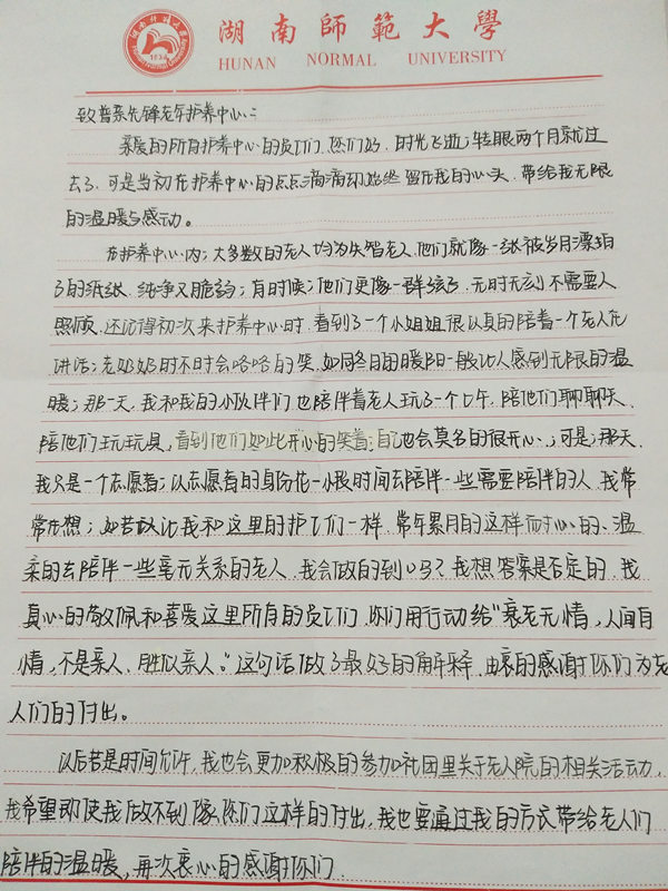 湖南師范大學(xué)志愿者在參加湖南普親老年養(yǎng)護(hù)中心先鋒機(jī)構(gòu)志愿服務(wù)后感言!