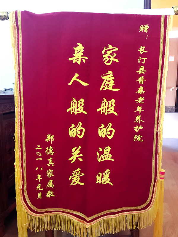 長汀普親老年養(yǎng)護院鄭德真家屬贈"家庭般的溫暖·親人般的關(guān)愛"錦旗。